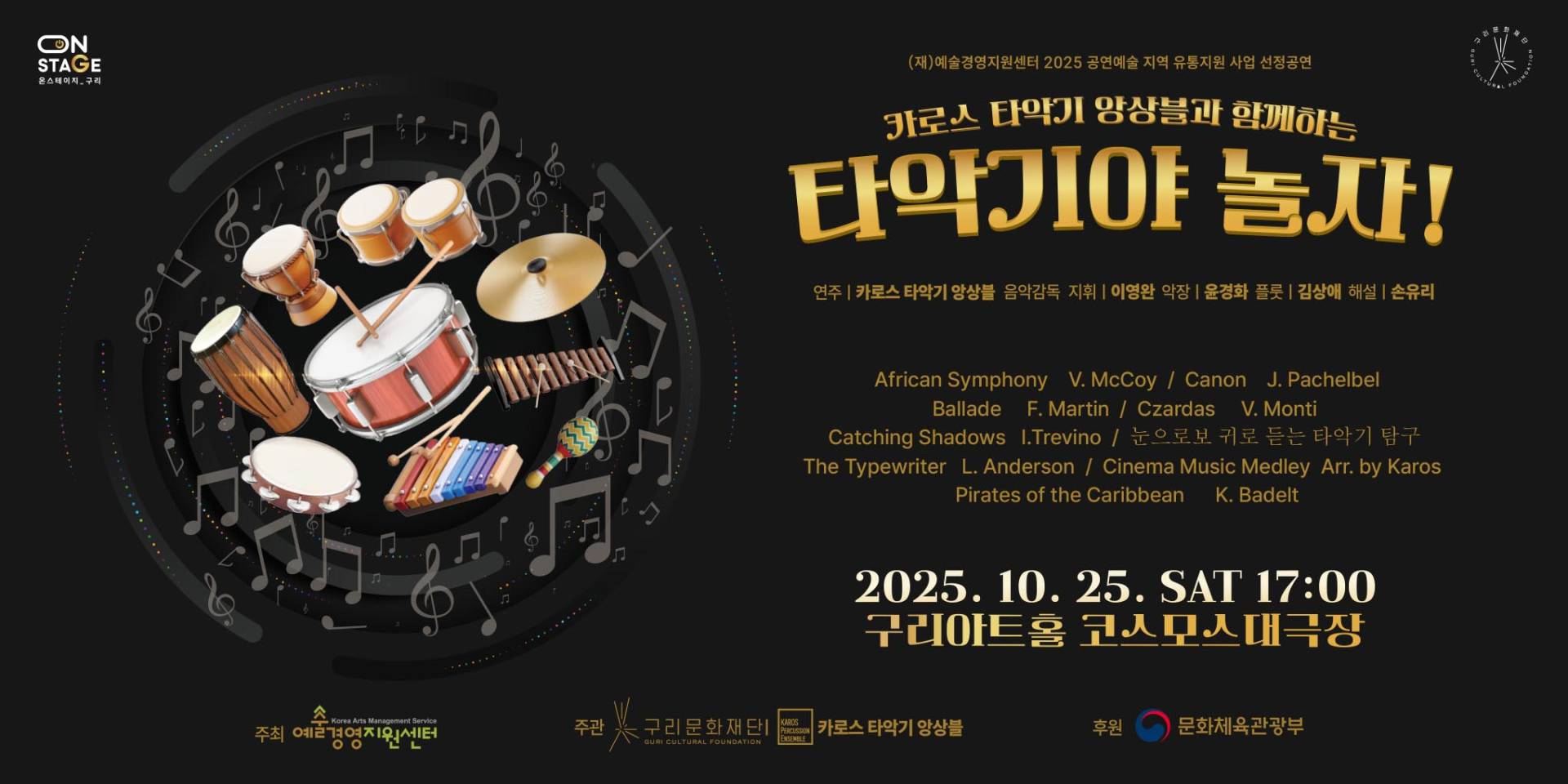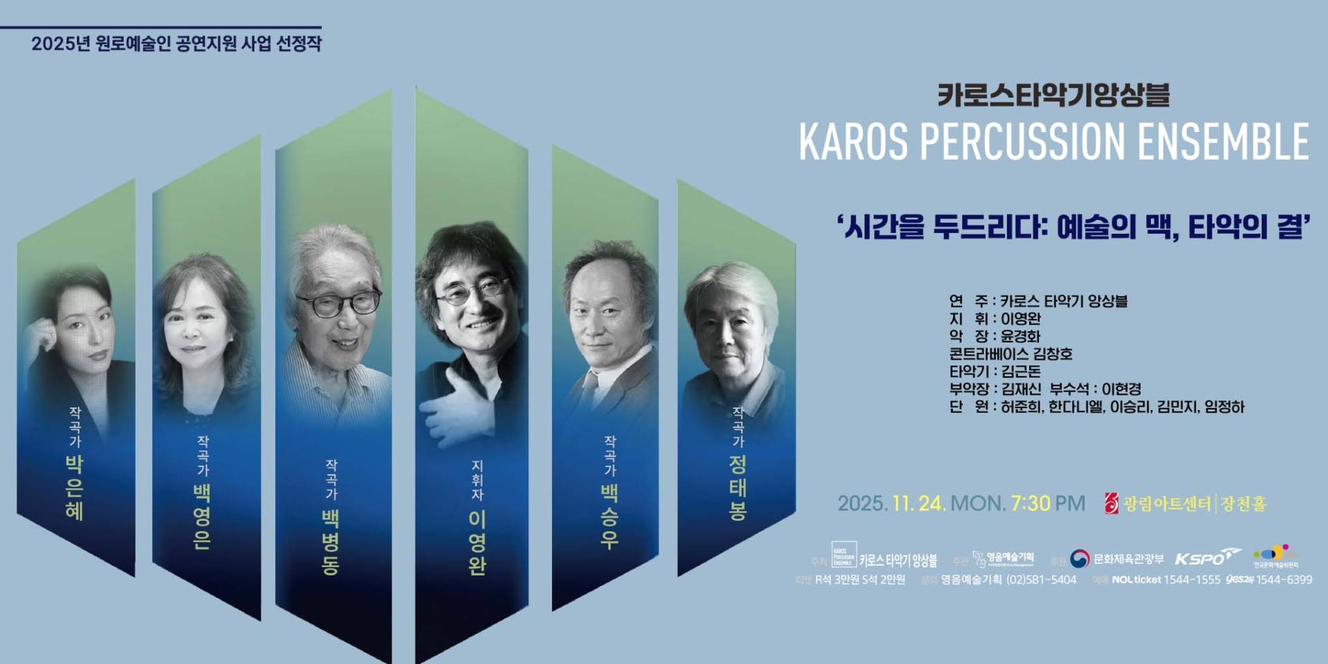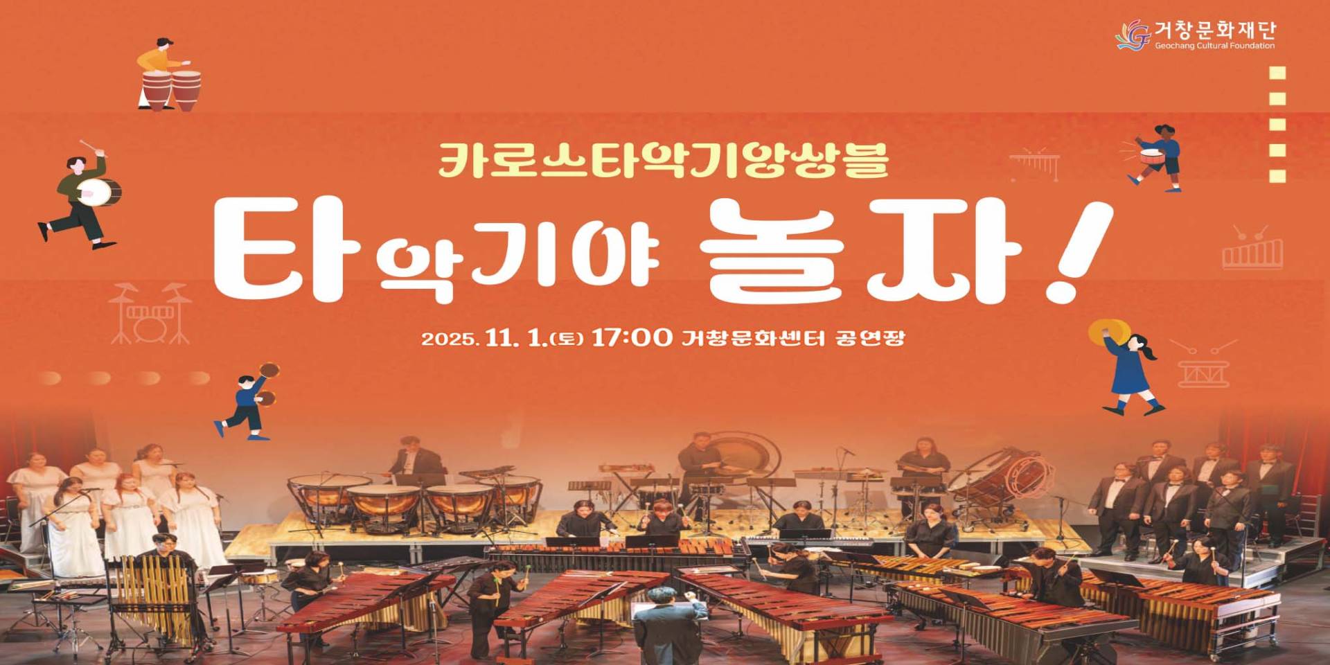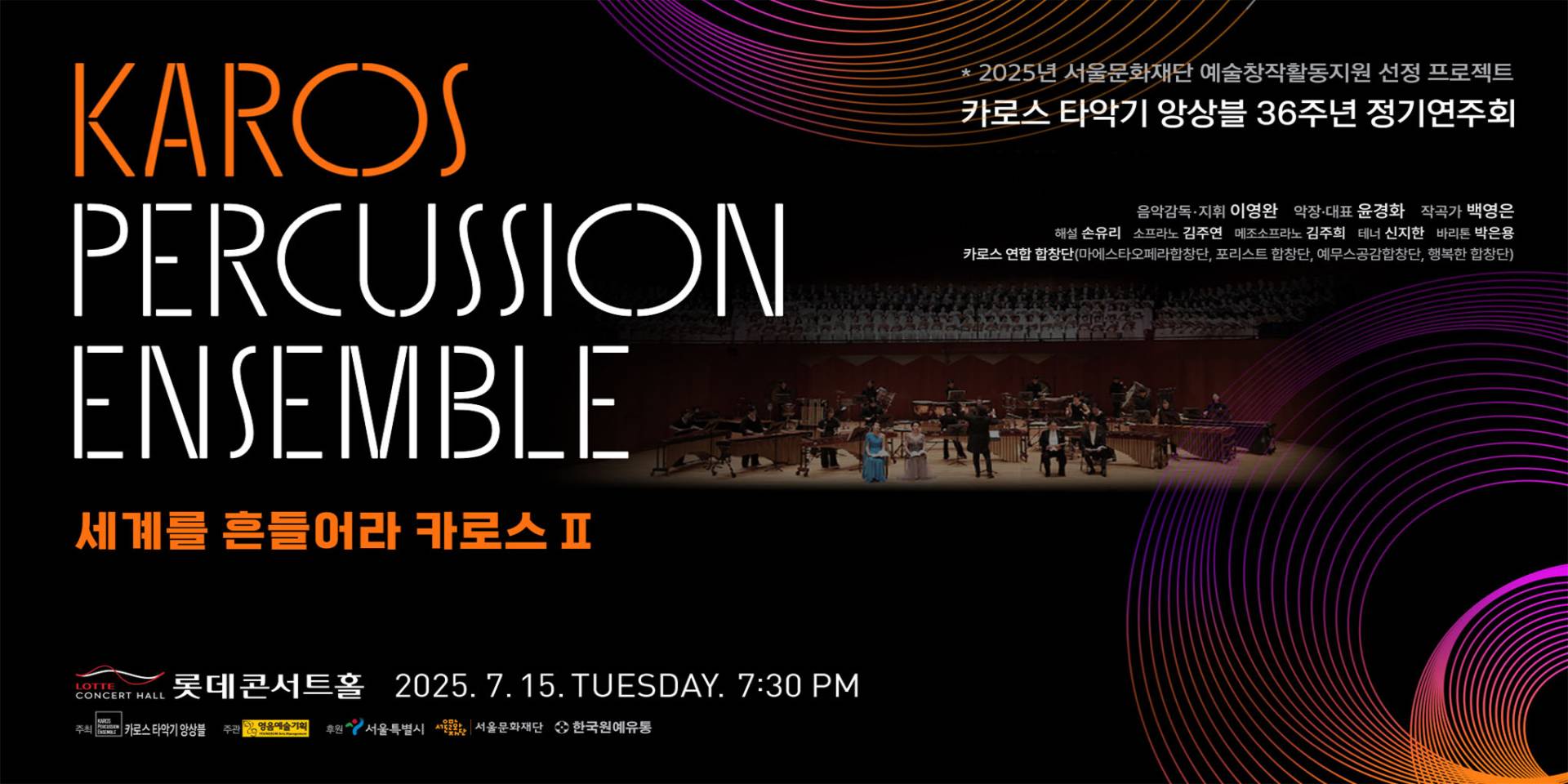 ㅇ 감동을 넘어 타악기의 새로운 지평을 열다 2025년 서울문화재단 예술창작활동지원 선정작인 이번 공연은 지휘자 이영완, 악장 윤경화, 정상급 성악가(김주연,김주희,신지한, 박은용)들과 167명의 대규모 합창단이 함께하며 손유리의 해설로 진행된다. 1부는 생상스의 Danse Macabre로 시작해 백영은 작곡가의 신작 시나위 세계 초연, 윤경화의 마림바 솔로 차르다시, 그리고 세계최초 타악기로만 편곡된 홀스트의 Jupiter가 연주된다. 2부는 라벨의 Bolero와 함께, 타악기와 167명 합창단이 어우러지는 베토벤 교향곡 9번 ‘합창’으로 마무리되며 색다른 감동을 선사할 예정이다.